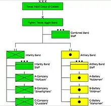 The members of the band are called BQs[34] and, since the band's inception, are part of the Corps of Cadets.[35] The Aggie Band is a major unit in the Corps, comparable in size to a brigade or wing. Unique among Corps units, however, the band is divided into two battalions of three "outfits" each, the Infantry Band and the Artillery Band.[36][37] All BQs are assigned to one of the six outfits. Each battalion is commanded by a Cadet Lieutenant Colonel and has its own command staff; each outfit is commanded by a Cadet Major. Outfits are further divided into platoons, squads, and fire teams,[38] led by a Cadet Captain, Cadet Staff Sergeant, and Cadet Corporal, respectively.[39] Due to its status as a Senior Military College, all cadets are required to take ROTC classes at least their first two years, though follow-on military service is not required.[7]