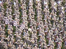 The band has over 400 members, though as of 2019, a typical performance fields slightly over 300 bandsmen.[43][44] Instrumentation consists of more than 60 trumpets, 40 trombones, 30 mellophones, 30 baritones, 25 bass horns, 40 drummers, and 90 assorted woodwinds, though the actual composition varies annually.[31] There are no flutes in the Aggie Band, as their position while being played would hinder the intricate marching maneuvers. Piccolos are used instead. All members of the band must have high school marching experience, an audition during the spring semester leading into the first fall semester of attendance to include major scales and sight reading, and an individual interview with the band director. Prospective members are also encouraged to participate in the Spend the Night with the Corps program to better understand the rigors of life in the Corps of Cadets.[31]