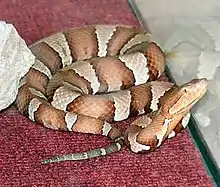 The Trans-Pecos copperhead (Agkistrodon contortrix pictigaster) [3] was once classified as a subspecies of the copperhead (Agkistrodon contortrix). However, DNA based studies published in 2008 and 2015, revealed no significant genetic difference between the Trans-Pecos copperhead (Agkistrodon contortrix pictigaster) and the broad-banded copperhead, (Agkistrodon contortrix laticinctus). The two subspecies were synonymized and elevated to full species, with the oldest published name, Agkistrodon laticinctus, having priority. The resulting taxonomy does not recognize the Trans-Pecos copperhead (Agkistrodon contortrix pictigaster) as a valid taxon.[4][5] Several subsequent reviews and species accounts have followed and supported the revised taxonomy.[6][7]: 436 p. [8] Information on this snake can be found in the Agkistrodon laticinctus article.