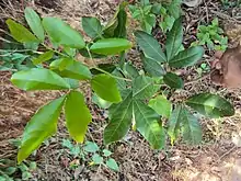 Timber is bright red color is a hard wood.[7] Bark is greyish brown in color. White latex can be exudate. Leaves are compound, imparipinnate, alternate; lamina narrow-elliptic to oblanceolate; apex bluntly acute to subacuminate; base acute to cuneate.[8] Flowers show axillary panicles inflorescence. Fruit is a brown or red, indehiscent[9] globose berry.[10]