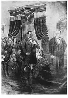 Agnes knelt and, crying, begged President Juárez to forgive the Emperor. The President's answer has become famous in Mexican history textbooks: "It causes me great pain, Madame, to see you like that on your knees; but even if every king and queen were in your place, I couldn't spare his life. It isn't me who takes it from him, it is the people and the law who claim his life". Juárez had already received telegraphs from most of the heads of the European states asking him to spare Maximilan. Upon Juárez's denial the brave woman answered, "Oh, if blood must be spilled, then take my life, the life of a useless woman; and spare that of a man who can still do much good in other country." Juarez did offer to spare the life of her husband.[8] The scene was painted by the Mexican painter Manuel Ocaranza.[9]
