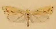The wingspan is 19–23 mm. The forewings are whitish-ochreous, sometimes more or less mixed with pale ferruginous-ochreous, usually with a few blackish scales; first and second discal stigmata black, beneath second a dark grey spot, sometimes faint. Hindwings ochreous grey- whitish, greyer posteriorly. The larva is blackish; dots black; head and plate of 2 shining black.[2]