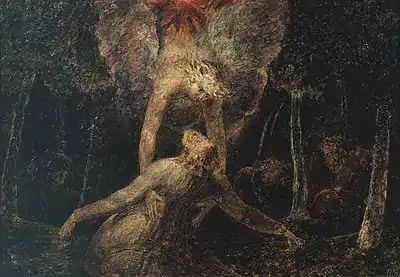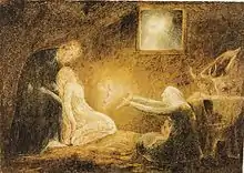 The Agony in the Garden is a small painting by William Blake, completed as part of his 1799–1800 series of Bible illustrations commissioned by his patron and friend Thomas Butts. The work illustrates a passage from the Gospel of Luke which describes Christ's turmoil in the Garden of Gethsemane before his arrest and Crucifixion following Judas's betrayal.[1] In Blake's painting a brilliantly coloured and majestic angel breaks through the surrounding darkness and descends from a cloud to aid and physically support Jesus in his hour of agony.[2] The work is dominated by vertical lines, formed both from the trees and from the two arms of the angel. Two inner lines converge on Christ's palms, evoking the nails driven through him during his crucifixion.