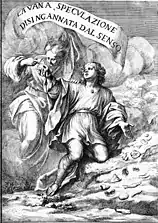 Scilla argued that fossils were not lusus naturae, whimsical simulacra of animals and plants created by God or divine Nature. He termed fossils as "jokes of time, not of nature." Athanasius Kircher had claimed that inanimate nature could produce pictures and sculptures that resembled living things. Girolamo Cardano claimed in his On the Subtlety of Things (1550) that he owned a piece agate that had the face of the Roman emperor Galba in it. Scilla dismissed Cardano's claim. Scilla may have seen fossil collections in Rome belonging to Cardinal Francesco Barberini (1597–1679) and his secretary Cassiano dal Pozzo (1588–1657). Scilla had also been influenced by Giovan Pietro Bellori (1613–1696) who had lectured on the role of the artist in inquiry. Bellori besought artists to go deep into a subject just as they examined the squaring of the circle and explored anatomy below the skin of the nudes they depicted, as depicted in Carlo Maratta's Tanto che basti (1682). Maratta had been a student of Sacchi alongside Scilla. Scilla gained reputation as a scientific illustrator and worked for Marcello Malpighi.[6] Scilla is considered to have been the first to use dotted lines to indicate reconstructions in paleontological illustration.[7] John Ray made use of some of Scilla's fossil illustrations. Scilla's fossil collection was acquired by John Woodward (1665–1728), an English physician, in 1717. These went into the University of Cambridge and became the nucleus of the collections of the Sedgwick Museum of Earth Sciences.[8][5][7]