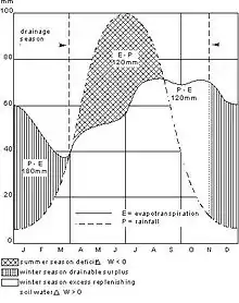 Sep–MarAnnual Precipitation P 360 360 720 Evaporation E 480 60 540 Change of storage ΔW –120 +120 0 Drainage requirement D 0 180 180 Irrigation requirement variable 0 variable