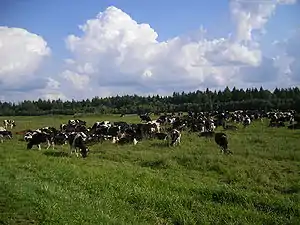 Agriculture in Belarus can be divided into two segments: livestock production and crop production. Crop production slightly outweighs livestock production in the country's product mix, accounting for around 55% of gross agricultural output since 1995.[1] Agriculture accounted for 7.9% GDP in 2013, while over the same year that sector accounted for only 3% GDP in the EU.[2]