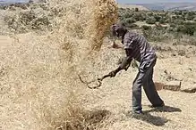 According to Ethiopia farming, this ploughing the land to prepare the soil for sow requires around two quarter of a year.[31] ploughing the land to soften the land takes three months and from sowing and seedling to the harvesting of the crops requires three to four months. Ethiopian farmers plough their land by combining the above tools for such three months to get yearly consumed food. The major product in are teff, wheat, maize, sesame, Niger, linseed etc. in addition to these cereals, they produce different types of fruits and coffee which are not seasonal.