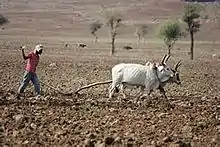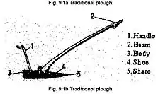 Almost all farming tools in Ethiopia are traditional and made from different types of wood.[30] These tools includes sickle, pick axe, plough shaft, ploughshare, plow, beam and animal force as a machines. The plough shaft, beam and ploughshare are made of wood and the sickle, pick axe, plow are made of metal. Ploughing the land using these tools is ambiguous and time-consuming.