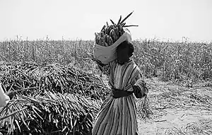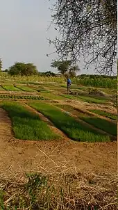 Agriculture is one of the dominant parts of Senegal's economy, despite the fact that Senegal lies within the drought-prone Sahel region. As only about 5% of the land is irrigated, Senegal continues to rely on rain-fed agriculture. Agriculture occupies about 75% of the workforce. Despite a relatively wide variety of agricultural production, the majority of farmers produce for subsistence needs. Millet, rice, corn, and sorghum are the primary food crops grown in Senegal. Production is subject to drought and threats of pests such as locusts, birds, fruit flies, and white flies.[1] Moreover, the effects of climate change in Senegal are expected to severely harm the agricultural economy due to extreme weather such as drought, as well as increased temperatures.[2]