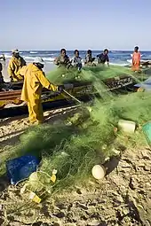 In 2005, seafood products represented 22% of Senegal's total exports and generated more than $366 million in national income from an annual catch of approximately 40,000 tons, against approximately $374 million for a catch of approximately 430,000 tons in 2004. The fishing industry is also a key sector for employment. At the local level, thousands of families depend on fish as a nutritional staple. The Government estimates that the sector employs more than 200,000 people and generates significant temporary employment in the informal sector, in particular through the artisanal fishing, using lines, traps, and nets with small-scale traditional fishing canoes.[1]