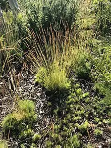 It is densely tufted, with hair like leaves and stems that grow up to 60 cm. Its spikelets are yellow-green in colour, and its lemmas are awned. The ligule is pointed.[1]