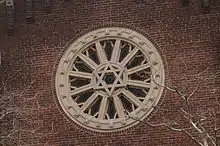 Located at 29 Grove Street in Stamford, Connecticut, the Agudath Sholom Synagogue was the second synagogue of the congregation. According to the National Register of Historic Places, the ground breaking occurred on September 12, 1933, and the final dedication was on April 27, 1941.[7] According to the congregation's website, the Agudath Sholom Synagogue was completed in 1938 and the "Chanukkat Habayit dedication occurred on the High Holidays".[3] The construction delayed by funding difficulties that resulted from the Great Depression.[7] The synagogue is a rectangular brick building constructed on a high basement. The building features a prominent rose window depicting the Star of David.[7]