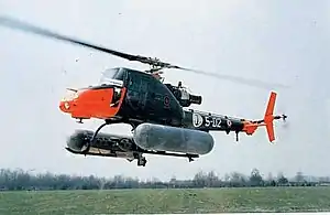 The Agusta A.106 was a single-seat light helicopter designed to provide an anti-submarine warfare (ASW) platform for the Impavido-class destroyers of the Italian Navy. The aircraft was provided with a sophisticated electronics suite by Ferranti for autostabilisation and contact identification. Two torpedoes could be slung under the fuselage. The tail and two-bladed main rotor could be folded for shipboard stowage, and the skid undercarriage had fittings for flotation bags.