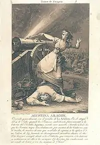 Agustina Raimunda Maria Saragossa i Domènech or Agustina of Aragón (March 4, 1786 – May 29, 1857) was a Spanish heroine who defended Spain during the Peninsular War, first as a civilian and later as a professional officer in the Spanish Army. Known as "the Spanish Joan of Arc,"[1] she has been the subject of much folklore, mythology, and artwork, including sketches by Francisco Goya and the poetry of Lord Byron.