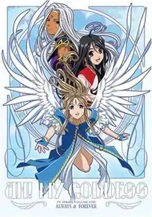Ah! My Goddess is an anime television series directed by Hiroaki Gōda, animated by Anime International Company, and produced by Tokyo Broadcasting System (TBS).[1] Composed by Himaguchi Shiro, the music was produced by Half H•P Studio with Iwanami Miwa as music director.[1] The series was coordinated by both Hiroaki Gōda and You Watanabe, with Matsubara Hidenori as character designer.[1] The series is based on the manga series Oh My Goddess! by Kōsuke Fujishima, using material from the first 20 volumes of the series over 24 episodes.[2] The series focuses on Keiichi Morisato, a college student who accidentally summons a goddess, Belldandy, and wishes for her to remain with him forever. The season began broadcasting in Japan on TBS on January 7, 2005, and ended its run on July 8, 2005.[3][4] Bandai Visual released the episodes in Japan between April 22, 2005, and November 25, 2005, as eight DVD compilations each containing three episodes.[5] The two original video animations (OVAs), which had not been broadcast, were released on a special DVD on December 23, 2005.[6] In Region 1, the anime was licensed to Media Blasters.[7] Six DVD compilations, containing all twenty-six episodes, were released by Media Blasters from September 27, 2005, and July 11, 2006.[8][9] Each DVD contained four episodes, excluding the first two, which contained five each. A premium complete season box set was released on November 7, 2006; the regular set followed on November 27, 2007.[10][11] MVM Films distributed the series in the United Kingdom, with the individual volumes released between February 5, 2007, and December 3, 2007, in six similar DVD compilations.[12][13] The box set followed on July 7, 2008.[14] Madman Entertainment distributed the series in Australia, with the six individual volumes released between July 26, 2006, and December 6, 2006.[15] The DVD collection containing all 26 episodes was released on October 10, 2007.[16]