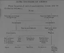According to Tattvarthasutra, one of the most important Jainism scriptures, "the severance of vitalities out of passion is injury".[10] Therefore, the higher the number of senses and vitalities a being has, the more is its capacity to suffer and feel pain. Hence according to Jainism, violence to higher-sensed beings like man, cow, tiger and those who have five senses and the capacity to think and feel pain attracts more karma than violence to lesser-sensed beings like insects, or single-sensed beings like microbes and plants.[11][12] Out of the five types of living beings, a householder is forbidden to kill, or destroy, intentionally, all except the lowest (the one sensed, such as vegetables, herbs, cereals, etc., which are endowed with only the sense of touch).[13] But, the ascetic is required to avoid even injuring the one-sensed form of life to the best of his ability.[14] Hence Jainism enjoins its adherents to completely avoid violence to higher-sensed beings and as far as possible minimise violence to lower-sensed and single-sensed beings. Jains agree with Hindus that violence in self-defence can be justified,[15] and they agree that a soldier who kills enemies in combat is performing a legitimate duty.[16] Jain communities accepted the use of military power for their defence, there were Jain monarchs, military commanders, and soldiers.[17]