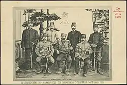 Toward the latter part of 1908, photographs of Niyazi and Enver had reached Istanbul and among school children in the city immersed in fanfare, they played with masks that depicted the revolutionaries.[100] In other images produced of the time the new sultan Mehmed V is presented in the centre flanked by Niyazi and Enver to either side.[101] As the actions of both men carried the appearance of initiating the revolution, Niyazi, an Albanian and Enver, a Turk (with Albanian heritage on his mother's side[102]) later got popular acclaim as "heroes of freedom" (hürriyet kahramanları) and symbolised Albanian-Turkish cooperation.[103] Niyazi was also known by the sobriquets "Hero of the Revolution" and the "Turkish Garibaldi".[13]