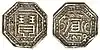 Ahom coinage or Coins of Ahom Kingdom, issued from 1648 CE –1824 CE. First Ahom coin was issued by Jayadhwaj Singha (r. 1648–1663)[1] and the last Ahom king to issue coin was Jogeswar Singha (r. 1821–1824). Coins were usually struck in octagonal shape, but square and round shapes coins were also issued but in limited quantity for special occasions and trade, the observe of the coin contained the name of the king and date of coin and the reverse contained the imprint of the deity of the concerned king.[2] The script used in coins was mainly Assamese, a few coins in Devanagari and Persian scripts were also issued. Ahom script in coins were extensively used during the war with Mughals. Chinese script was also used in order to meet out trade with Tibet, but is extremely rare.[3]