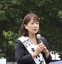 Aoki's father is a former member of the Chikura town assembly.[1] In 2001 Aoki sought entry into the Ozawa Ichiro Seiji Juku, a cram school for aspiring politicians operated by Ichiro Ozawa, but was unable to enroll due to being one year over the school's upper age limit of 35.[1] Despite this, Aoki received Ozawa's recommendation and joined the Liberal Party, a party founded by Ozawa three years earlier.[1] In September 2003 the Liberal Party merged into the Democratic Party of Japan (DPJ) and Aoki contested the Chiba 12th district as a DPJ candidate at the October 2003 general election. Aoki received 40.8% of the vote but lost to the incumbent Liberal Democratic Party member Yasukazu Hamada, who received 53.9%.[2] The DPJ received 40 per cent of the vote in the Southern Kanto proportional representation block, entitling them to nine of the 22 seats in the block. Aoki's comparatively low margin of defeat meant she gained the DPJ's final seat in block.[3] In the 2005 general election Aoki again contested the Chiba 12th district against Hamada, this time losing by more than 50,000 votes[4] and failing to retain her seat in the proportional representation block.[5] During her two years in the House of Representatives Aoki served on the Committee on Health, Welfare and Labour,[6] Committee on Education, Culture and Science[7] and the Research Commission on the Constitution.[8]