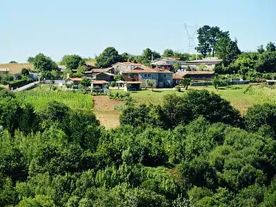 Aiazo is placed in the south-west of the municipality of Frades (Ordes' shire), 30 km driving from Santiago de Compostela and 50 km driving from Coruña. By the south, Aiazo borders with the Arzúa's shire, by the Tambre river; by the north and the east it borders with the rest of Frades, and by the west with the municipality of Oroso. The relief, characterized by the Maruzo river (in the north) and Tambre river (in the south), over a geological area determined by the schist complex of Ordes, forms a landscape with soft hills.[1] In Aiazo there are agrarian lands and forests around the populated areas. The forests are mostly of eucalyptus and pines in plantations, and Galician typical oak forest, with oaks, birchs, alders, willows, etc. Another frequent kind of forest in Aiazo is the riverbank forest near the Tambre, Gaiteiro, and Maruzo rivers. Maruzo's riverbank is part of the Río Tambre's ecological network Natura 2000, this protection will be increased in the future to the Tambre's riverbank. In the beginning, Aiazo's population was concentrated in the three principal neighborhoods, born around an aquifer. Historically Fontelo, Fonsá and A Devesa were the most important villages, the three with similar characteristics of terraced houses. To complement the three first settlements, country houses appeared, like Os Pereiros, in A Devesa, or O Casal, in Fontelo, and new settlements grew, like A Torre or A Carballeira. In the late 20th century, many isolated houses appeared, some of them following a ribbon development in the way between Ponte Carreira and Ordes, and other around the primary neighborhoods.[1] Population ageing is a phenomenon occurring in Aiazo, although in the last years tendency is to receiving immigrants, especially because of the 2008 crisis.