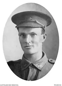 Henry Archibald ("Archie") Donaldson enlisted in January 1916, at the age of 29. He was a school teacher living in Portland, Victoria. As a private in the 58th Australian Infantry Battalion he fought in 15 different locations, before falling in battle at the Somme on 13 March 1917. He is buried in Bull's Road Military Cemetery, Flanders, Picardy in France. His service number was 5089.[16]