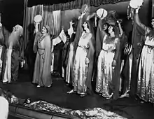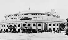 For several years, she traveled and raised money for the construction of a large, domed church in the Echo Park area of Los Angeles, named Angelus Temple, in reference to the Angelus bell and to angels.[37] Not wanting to incur debt, McPherson found a construction firm willing to work with her as funds were raised "by faith",[38] beginning with $5,000 for the foundation.[39] McPherson mobilized diverse groups to fund and build the church, by means such as selling chairs for Temple seating.[40][41] In his book 'Growing up in Hollywood' Robert Parrish describes in detail attending one of her services.[42]
