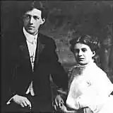 While attending a revival meeting in 1907, McPherson met Robert James Semple, a Pentecostal missionary from Ireland.[17] She dedicated her life to Jesus and converted to Pentecostalism.[16] At the meeting, she became enraptured by Semple and his message. After a short courtship, they were married in an August 1908 Salvation Army ceremony. Semple supported them as a foundry worker and preached at the local Pentecostal mission. They studied the Bible together, then moved to Chicago and joined William Durham's Full Gospel Assembly. Durham instructed her in the practice of interpretation of tongues.[18]