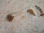 A pair of large, bare footprints, each about 1 m (3 ft 3 in) in length, are carved into the stone floors of the portico, followed by a single footprint carved beyond the first two, and another single footprint carved into the threshold, "marking the deity’s procession into the cella". [4][8][12] It is also conjectured that these foot prints could be of unidentified "immense clawed creatures". The inference is that the right footprint seen on the threshold, which is spaced at about 10 m (30 ft) from the first footprint, could be of human or goddess, 20 m (66 ft) in height. Monson has also noted that the deities in all the Ain Dara temple reliefs have "shoes with curled-up toes". Hence, the source of the footprints, whether of gods or humans or animals, is debatable.[4]
