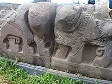 A courtyard built with sandstones provides the approach to the temple. The courtyard is paved with flagstones where a chalkstone basin for ceremonial purposes is seen.[4] The temple, 30 by 20 m (98 by 66 ft) in size, faces southeast.[3][4] Its exterior contains a cherubim relief.[14] The entrance porch, or portico, marked by two basalt piers or pillars, and a wide hall, were not roofed over and were part of an open courtyard. The entrance pillars appear to have architectural and cultic significance.[3] A sphinx and two lions decorate the temple portico flanking the three steps (out of four) made from basalt.