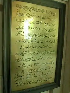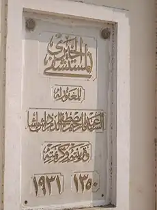 The translation of the metallic plate is: "The honourable late Pasha Abdel-Rahim Moustafa El-Demerdash (may he have all God's forgiveness) and the two ladies his wife Zainab Hanem El-Demerdashiah and his daughter Qout Alqoulob Hanem El-Demerdashiah have donated—on the 5th of August 1928—by the piece of land on which this Hospital was erected which is 15,000 meter square, and donated the sum of 100,000 Egyptian Royal Pounds to be divided as 40,000 for the building of the hospital and 60,000 to be put into a Waqf and its benefits are dedicated to the expenses of running the hospital."