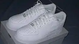 The shoes are sold in 5 different styles: super low, low, mid, high, and super high. The mid comes with a connected strap. The high-top Air Force 1s come with a velcro strap; the mid-top strap is secured to the shoe while the high-top's strap is movable and removable on some versions. Although the shoe comes in different colors and color schemes, the most common Air Force 1s sold are solid white (also referred to as "white on white"), the second most common being solid black ("black on black").[4] Another identifying characteristic of an Air Force 1 shoe is a small medallion secured to the bottom of the laces but with holes on both sides so it can be removed by sliding it off the shoe lace.[5] The medallion is engraved with the inscription "AF-1", with the year "'82" inscribed beside it, and has historically been colored silver.