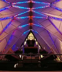 The building's tetrahedrons form the walls and the pinnacled ceiling of the Protestant Chapel.[9] Stained glass windows provide ribbons of color between the tetrahedrons, and progress from darker to lighter as they reach the altar. The chancel is set off by a crescent-shaped, varicolored reredos with semi-precious stones from Colorado and pietra santa marble from Italy covering its 1,260-square-foot (117 m2) area. The focal point of the chancel is a 46-foot (14 m) high aluminum cross suspended above it. The pews are made of American walnut and African mahogany, the ends being sculpted to resemble World War I airplane propellers. The backs of the pews are capped by a strip of aluminum similar to the trailing edge of a fighter aircraft wing.