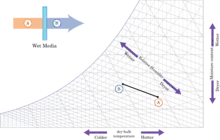 For direct evaporative cooling, the direct saturation efficiency, , measures in what extent the temperature of the air leaving the direct evaporative cooler is close to the wet-bulb temperature of the entering air. The direct saturation efficiency can be determined as follows:[32]