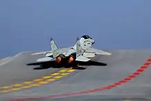 A MiG-29 launching over the ski-jump ramp on a Kuznetsov-class aircraft carrier can take off at a speed of about 70 knots (130 km/h; 81 mph), instead of the usual 140 knots (260 km/h; 160 mph) (depending on many factors such as gross weight).[15]