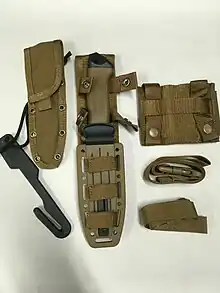 Other features, such as an electrically insulated handle, were deemed desirable, but not required. Packaged in the sheath are a special tool for cutting seat belts and a diamond impregnated sharpening disk. The ASEK, made by Ontario, was adopted after trials by United States Army Natick Soldier Research, Development and Engineering Center in Natick, Massachusetts.[2][3]