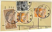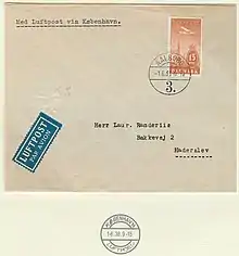 The 1925 series comprises Denmark's 1st airmail stamps and their issue corresponded with the opening of Kastrup airport in Copenhagen and the carriage of regular airmails by Det Danske Luftfartselskab, the Danish national airline.[1] The 1925 series was issued in denominations of 10, 15, 25, 50 øre and 1 krone. All the values were reissued in the 1930s.