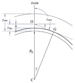In the figure at right, an observer at O is at an elevation above sea level in a uniform radially symmetrical atmosphere of height . The path length of a light ray at zenith angle is ; is the radius of the Earth. Applying the law of cosines to triangle OAC,