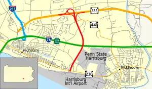 The Airport Connector is a 1.9-mile-long (3.1 km) freeway in the Harrisburg, Pennsylvania, area in the Commonwealth of Pennsylvania. It begins at Harrisburg International Airport and runs north to Pennsylvania Route 283 (PA 283). There is one intermediate interchange with PA 230.