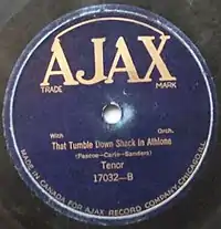Ajax was a subsidiary of the Compo Company of Lachine, Quebec.[2] Although a U.S. trademark on the name "Ajax" was filed in 1921, Ajax did not issue its first record until October 1923.[3][4] The head of Ajax Records was H. S. Berliner, son of disc record pioneer Emile Berliner. Berliner's corporate headquarters were in Quebec City, Quebec, although U.S. issues listed the company as being based in Chicago, Illinois, where its U.S. office was located, but apparently no recording studio. Ajax is known to have used Compo's recording studios in Montreal and New York City.[3] In addition to the sides which Ajax recorded themselves, the label also issued discs pressed from masters leased from New York Recording Laboratories and the Regal Record Company.[3] The last Ajax released was in August 1925.