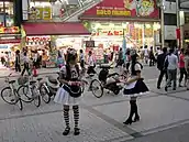 The influence of otaku culture has shaped Akihabara's businesses and buildings to reflect the interests of otaku and gained the district worldwide fame for its distinctive imagery.[9] Akihabara tries to create an atmosphere as close as possible to the game and anime worlds of customers' interest. The streets of Akihabara are covered with anime and manga icons, and cosplayers line the sidewalks handing out advertisements, especially for maid cafés. Release events, special events, and conventions in Akihabara give anime and manga fans frequent opportunities to meet the creators of the works they follow and strengthen the connection between the region and otaku culture. The design of many of the buildings serves to create the sort of atmosphere that draws in otaku. Architects design the stores of Akihabara to be more opaque and closed to reflect the general desire of many otaku to live in their anime worlds rather than display their interests to the world at large.[2][10]