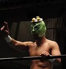 On February 29, 2012, All Japan Pro Wrestling announced that Raijin would be returning to the promotion from his American excursion on March 20.[34] In his return match, Raijin teamed with Kaz Hayashi and Minoru Tanaka in a losing effort against the team of Gillette, Hiroshi Yamato and Kai, with Gillette pinning Raijin for the win.[35] On April 1, Kawabata debuted as the masked character Sushi, when he entered the 2012 Junior Tag League alongside Bushi.[36] Sushi and Bushi made it all the way to the finals of the tournament on April 14, where they were defeated by Kaz Hayashi and Shuji Kondo.[37] In July, Sushi took part in the 2012 Junior Hyper League, where he finished with a record of three wins and two losses, failing to advance from his round-robin block.[38] Following Bushi's departure from All Japan, Sushi formed a new partnership with rookie Andy Wu, with the two taking part in the Junior Hyper Tag League in early 2013, where they failed to advance to the finals.[39][40][41] On April 26, Kawabata as Sushi received his first shot at the World Junior Heavyweight Championship, but was defeated by the defending champion Yoshinobu Kanemaru.[42] Sushi re-entered the title picture on October 12 by pinning Kanemaru in a six-man tag team main event.[43] Sushi received his title shot on October 27, but was again defeated by Kanemaru.[44]
