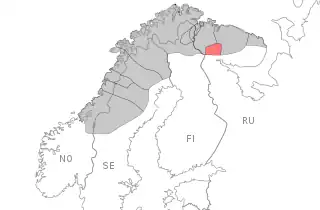 ![]() Akkala Sami language area (red) within Sápmi (grey) | |