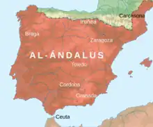 Muslim and Arab forces from Northwest Africa, under the military leadership of Ṭāriq ibn Ziyād, conquered al-Andalus between 711 and 718 C.E. At the time, the region was under the control of the Visigoths but, after the Battle of Guadalete, the area fell to the Umayyad Caliphate. The Caliphate collapsed in the East in 750 CE, but continued on al-Andalus until 1031 when it broke up into 23 small emirates known as the tafia kingdoms. These became the main rivals of the Christian territories on the Peninsula. The Umayyads were then subsequently replaced by the Abbasid Dynasty in the East. Many Christians fled to the Northern parts of the peninsula and established the kingdom of Asturias, which eventually split into the kingdoms of Castile, Galicia, and León.[2] The Asturians conquered the Umayyads at the Battle of Covadonga in 722; this is when many historians determine that the Reconquista began.[3] After this event, the Umayyads faced the loss of Galicia (739), León (754), Barcelona (801), and Salamanca (939). According to the historian Alan Heston, the Caliph of Córdoba, al-Mansur, "undertook more than fifty jihads into Christian areas of northern Spain to pillage and eventually expand Muslim rule to all of present-day Spain."[4] In 997, al-Mansur called for the destruction of the Church of St. James in León. This site served as an important pilgrimage destination for Christians since it claimed to hold the tomb of James, the brother of Jesus. The tomb was left alone, but the church itself was dismembered, with the doors and bells taken to Córdoba to expand its mosque. The year 1000 saw the weakening of Islamic hold on the peninsula since al-Mansur left Córdoba in a weaker condition than he received it and the Umayyad caliphate finally broke apart in 1031.[4]