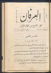 The Arabic Shiite reform journal al-Irfan (Arabic: العرفان; DMG: al-ʿIrfān; "Knowledge") was founded in Beirut by Aḥmad ʿĀrif az-Zain (1883-1960) in 1909.[1] From 1910 the publication was transferred to a special printing house in Saida, South Lebanon. Az-Zain, who had worked before for different magazines, among others Thamarāt al Funūn (1875-1908), was in charge until 1960. Together with Aḥmad Riḍā (1872-1953) and Sulaimān Ẓāhir (1873-1960) he initiated a new stage of Nahda with this encyclopedic educational journal in South Lebanon.[2][3]