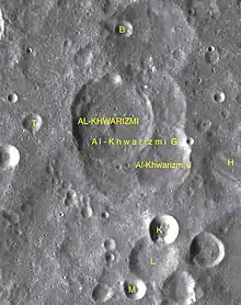 By convention these features are identified on lunar maps by placing the letter on the side of the crater midpoint that is closest to Al-Khwarizmi.