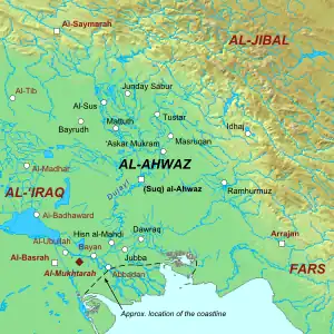 Al-Muhallab was recalled from Mosul to confront the Azariqa's resurgence and renewed raids against Ahwaz, and Ibn al-Ashtar replaced him as governor.[1][9][19] Despite the intensified efforts of al-Muhallab, the Azariqa's defense kept him confined to the west bank of the Dujayl river.[9] In 690, eight months after he was reassigned to the war against the Azariqa, Mus'ab was defeated and killed by the Umayyad army led by Caliph Abd al-Malik ibn Marwan at the Battle of Maskin.[9][20] At the time, al-Muhallab was engaged against the Azariqa in the environs of Ahwaz.[21] Upon hearing news of Abd al-Malik's victory and conquest of Iraq, al-Muhallab had his troops swear allegiance to the Umayyad caliph.[22] Abd al-Malik's kinsman and governor over Basra, Khalid ibn Abdallah, relieved al-Muhallab of command and assigned him to collect the kharaj (land tax) of Ahwaz.[1] The governor's brother, Abd al-Aziz, was appointed in al-Muhallab's place, but was routed by the Azariqa.[23] After Abd al-Malik was informed of his forces' defeat, he sent a letter reproaching Khalid for not utilizing al-Muhallab, "who is fortunate in judgment, good in management, skillful and experienced in war—a man of war, and the son of men of war".[24] Afterward, in 693/94, Abd al-Malik directly appointed al-Muhallab commander of the war against the Azariqa, but later that year, his troops deserted the field against them at Ramhormoz following news of the death of Bishr ibn Marwan, Khalid's replacement as governor of Basra.[1]