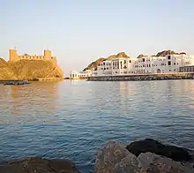 "Muscat" means "anchorage".[3] True to its name, Old Muscat is a natural port in a strategic location between the Persian Gulf and the Indian Ocean. It lies on the coast of the Gulf of Oman on a bay about 700 metres (2,300 ft) long, protected from the sea by a rocky island.[4][lower-alpha 1] The port is surrounded by mountains, making it difficult to access from the landward side.[3] Muscat may have been described by the geographer Ptolemy in the 2nd century, who noted a "concealed harbor" in the region.[3]