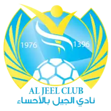 Al-Jeel Club (Arabic: نادي الجيل) is a Saudi Arabian football club based in Hofuf, Al-Hasa.[1] Founded in 1976, the club competes in the MS League , the second tier of Saudi football.[2] Al-Jeel play their home games at the Prince Abdullah bin Jalawi Stadium in Al-Hasa.[3] Al-Jeel have finished as runners-up in the Saudi Second Division twice in 1986[4] and 2010.