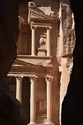 Al-Khazneh (Arabic: الخزنة; "The Treasury") is one of the most elaborate temples in Petra, a city of the Nabatean Kingdom inhabited by the Arabs in ancient times. As with most of the other buildings in this ancient town, including the Monastery (Arabic: Ad Deir), this structure was carved out of a sandstone rock face.