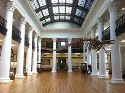 The Alabama Museum of Natural History is the state's natural history museum, located in Smith Hall at the University of Alabama campus in Tuscaloosa. The oldest museum in the state, it was founded in 1831. The exhibits depict the natural diversity of Alabama from the Age of Dinosaurs, the Coal Age, and the Ice Age. Collections include items relating to geology, zoology, mineralogy, paleontology, ethnology, history, and photography.[1] The Grand Gallery Exhibition Hall houses a replica of a Basilosaurus cetoides, an Eocene whale that has been designated as the State Fossil. Exhibits of special interest include the skull of an American mastodon dredged from the Tombigbee River near Demopolis and the Hodges meteorite. The latter hit a woman as it fell to earth near Sylacauga on November 30, 1954.[2] The museum sponsors expeditions throughout the year, as it has since 1979.[3]